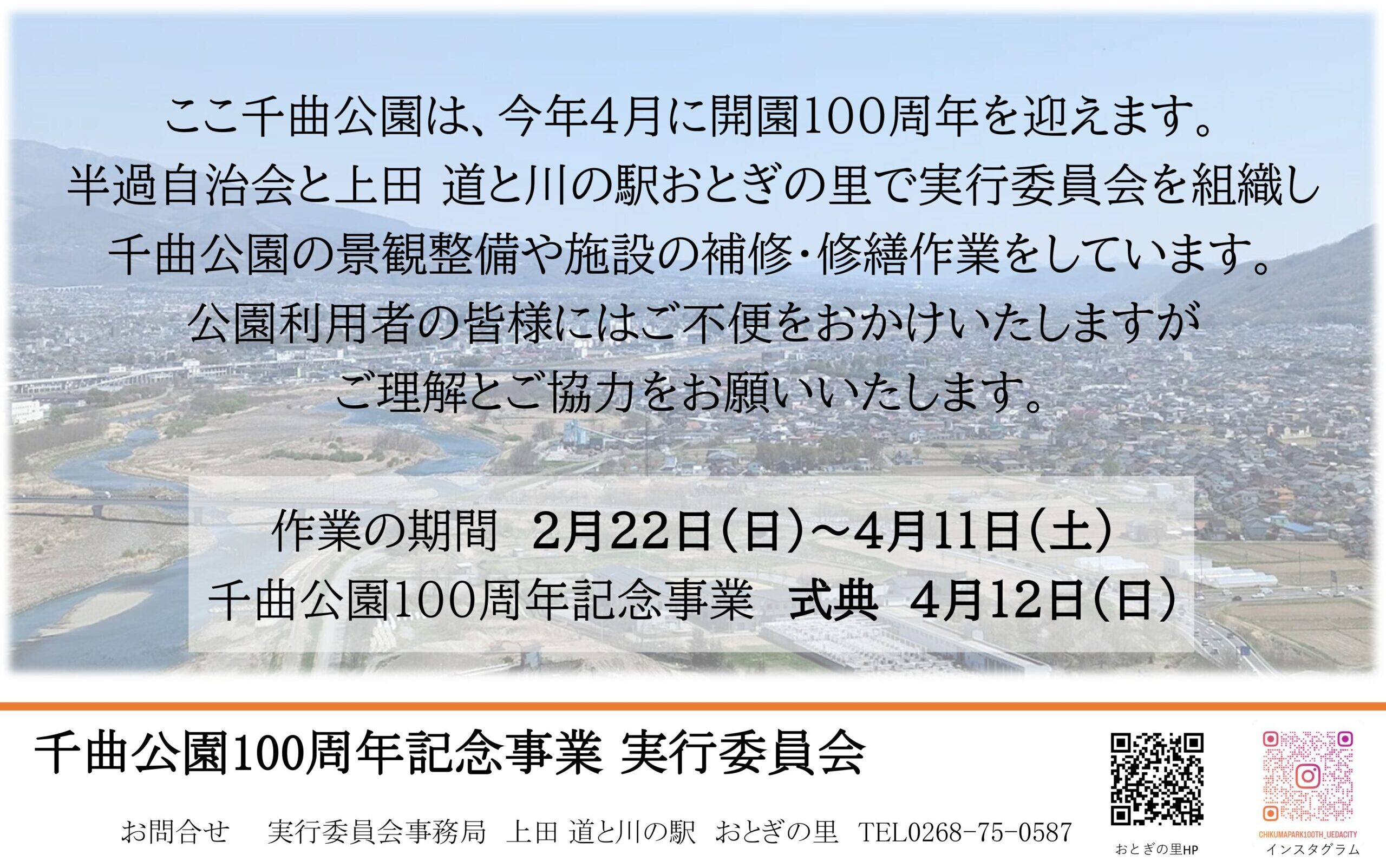 記念事業活動報告(景観整備) 2026.02.20 千曲公園100周年記念事業 活動報告 2026年2月より、千曲公園の景観整備や施設の修繕作業が始まりました!作業は4月11日(土) まで、安全第一で進めております。期間中にご来園のお客様にはご不便をおかけいたしますが、千曲公園のさらなる魅力アップのため、何卒ご理解とご協力を賜りますようお願いいたします。 なお、作業にあたっている実行委員会メンバーは、地元の有志が中心です。千曲公園の歴史や見どころ、道の駅をはじめとする周辺地域のこれまでの歩みなどについてもご案内できますので、どうぞお気軽にお声がけ・お尋ねください。