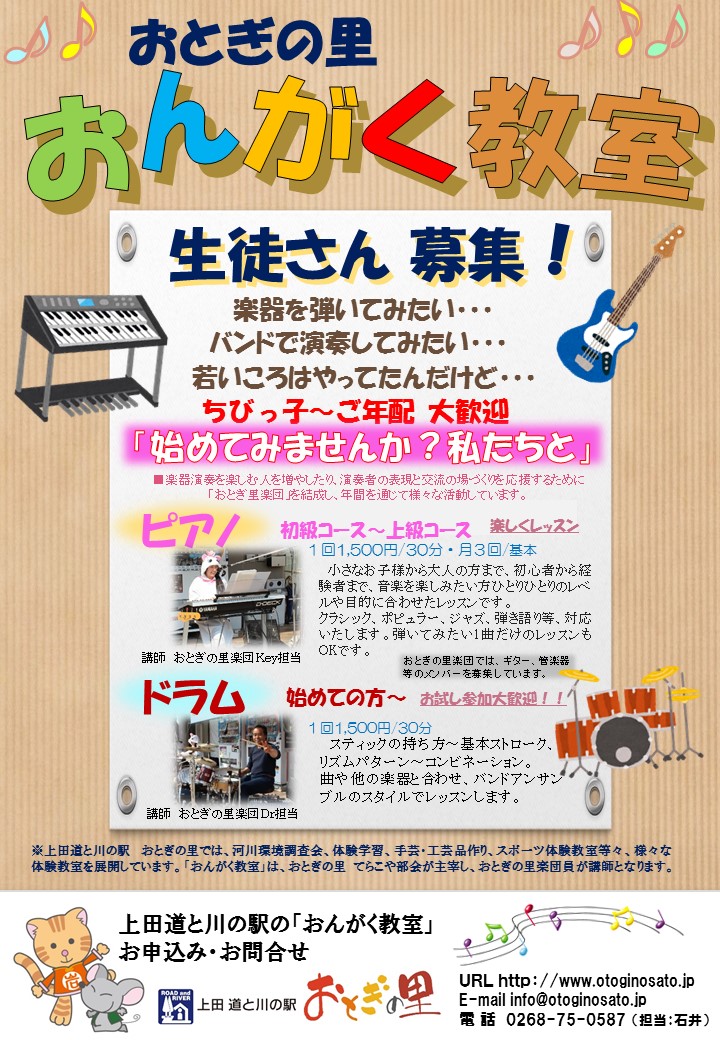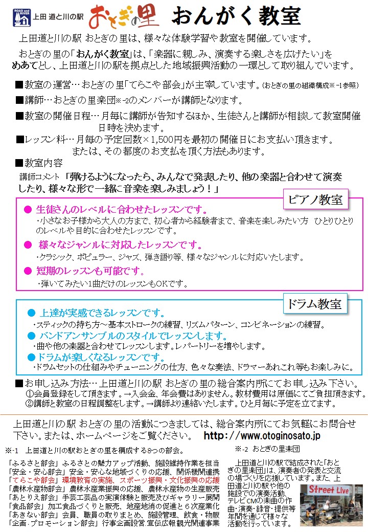 おんがく教室 Private Music Lessons 上田 道と川の駅おとぎの里では、おとぎの里の組織構成のひとつである「てらこ屋部会」が主宰となり、様々な体験学習や教室を開催しています。おんがく教室は「楽器に親しみ、演奏する楽しさを広げる」ことを目的に、地域振興活動の一環として実施しています。