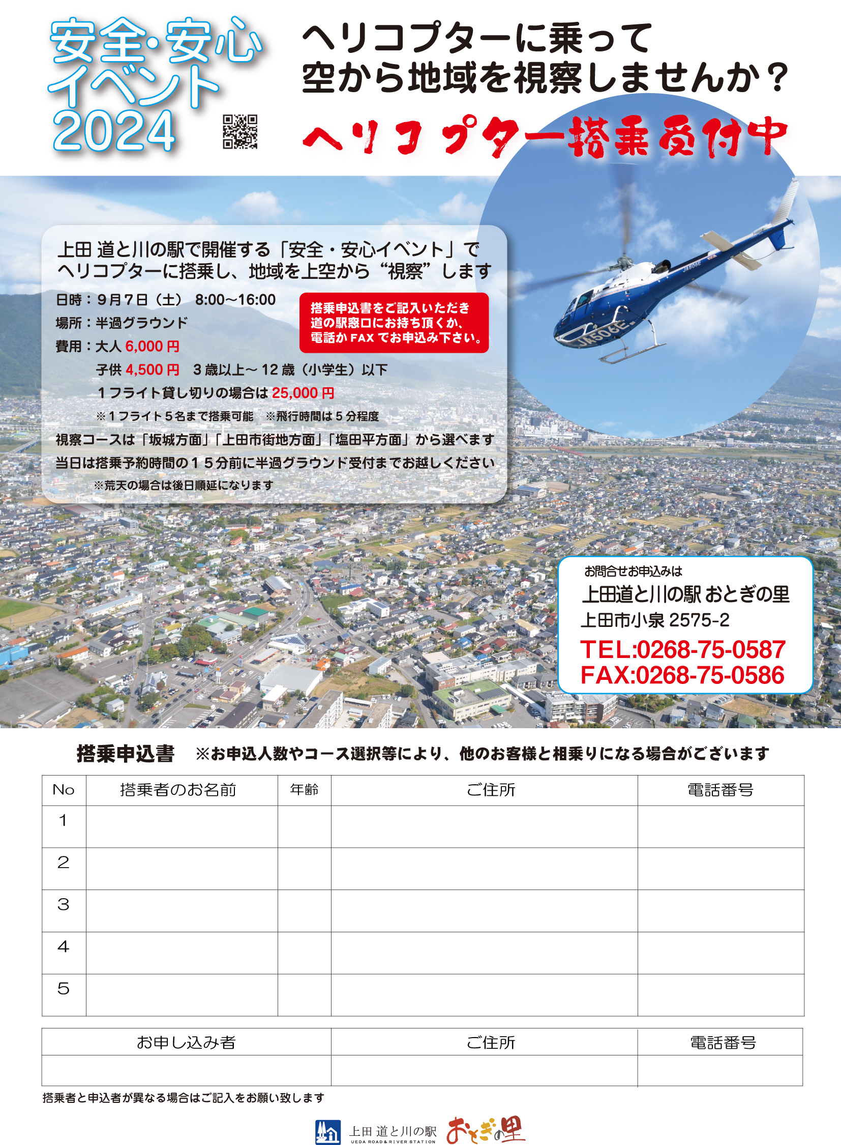 ただいま、搭乗申し込みを受け付けておりますので、ご希望の方は上田道と川の駅事務所までお電話でお申込みいただくか、申込書をFAXまたは事務所までご持参いただきますようお願い申し上げます。